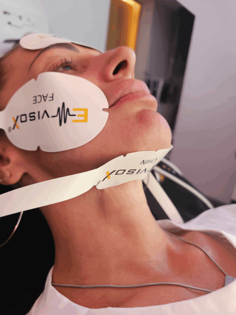 Genau hier setzt EMVisioX® an: ein sanftes, nadelfreies 20-Minuten-Treatment, das die Gesichtsmuskulatur aktiviert und gleichzeitig die Haut strafft. Eine hocheffektive Kombination aus elektromagnetischer Muskelstimulation (EMS) und Radiofrequenz, die für ein natürlich frisches, pralles und definierteres Hautbild sorgen kann.